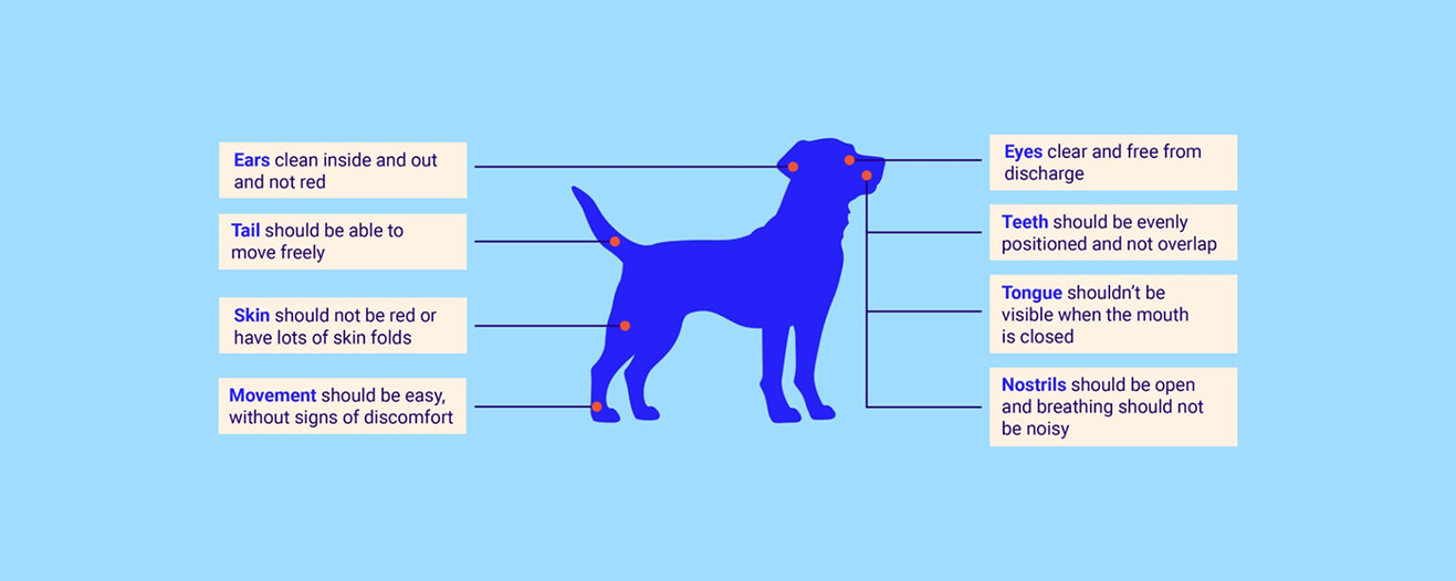 Keeping an eye on your dog’s teeth is important, so look out for constant drooling, a very undershot/overshot jaw and a tongue that sticks out most, or all, of the time.